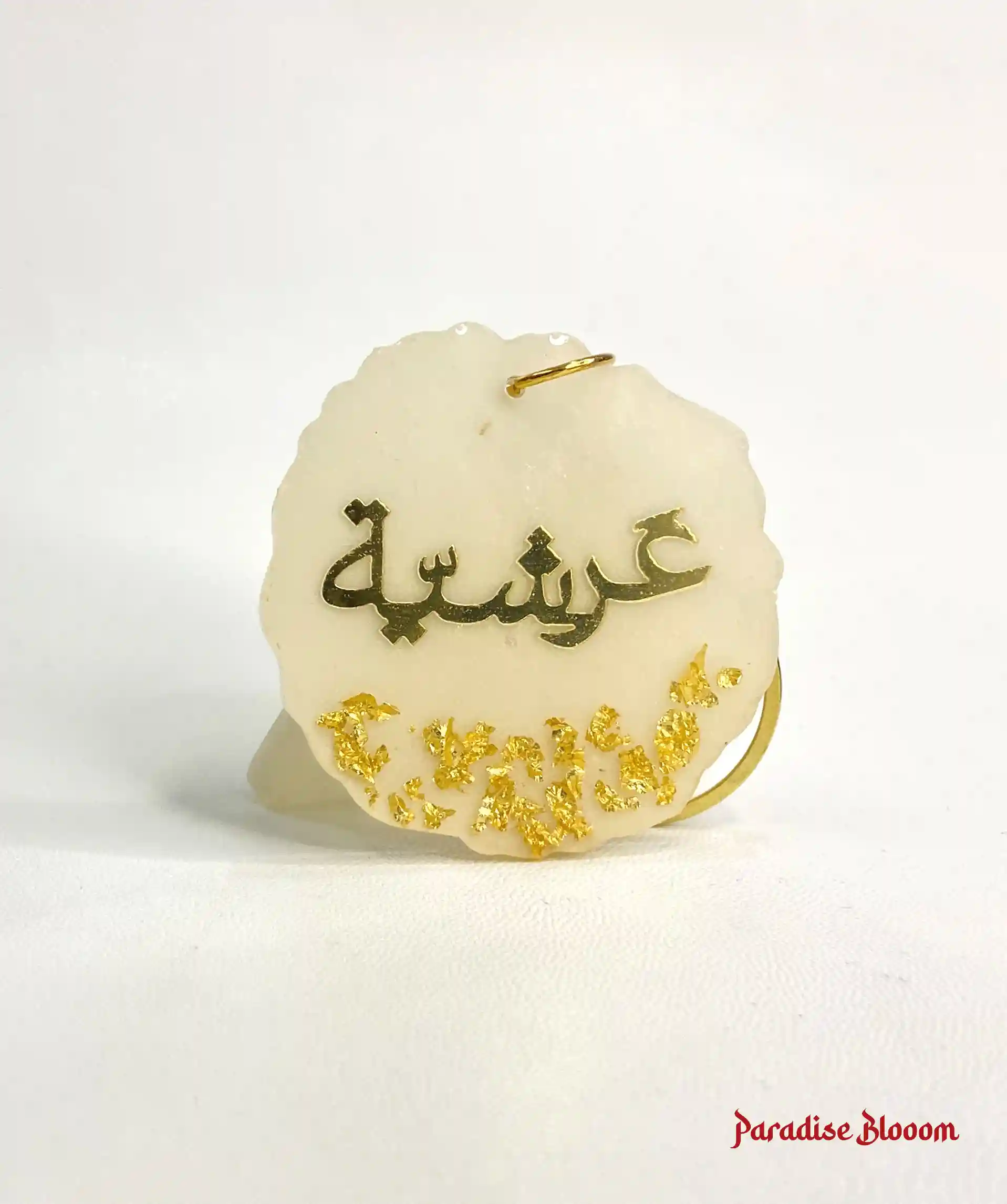 ✨ The round resin charm beautifully showcases your name in Arabic calligraphy, while the second charm features your English initial letter, both delicately embedded with shimmering gold flakes.