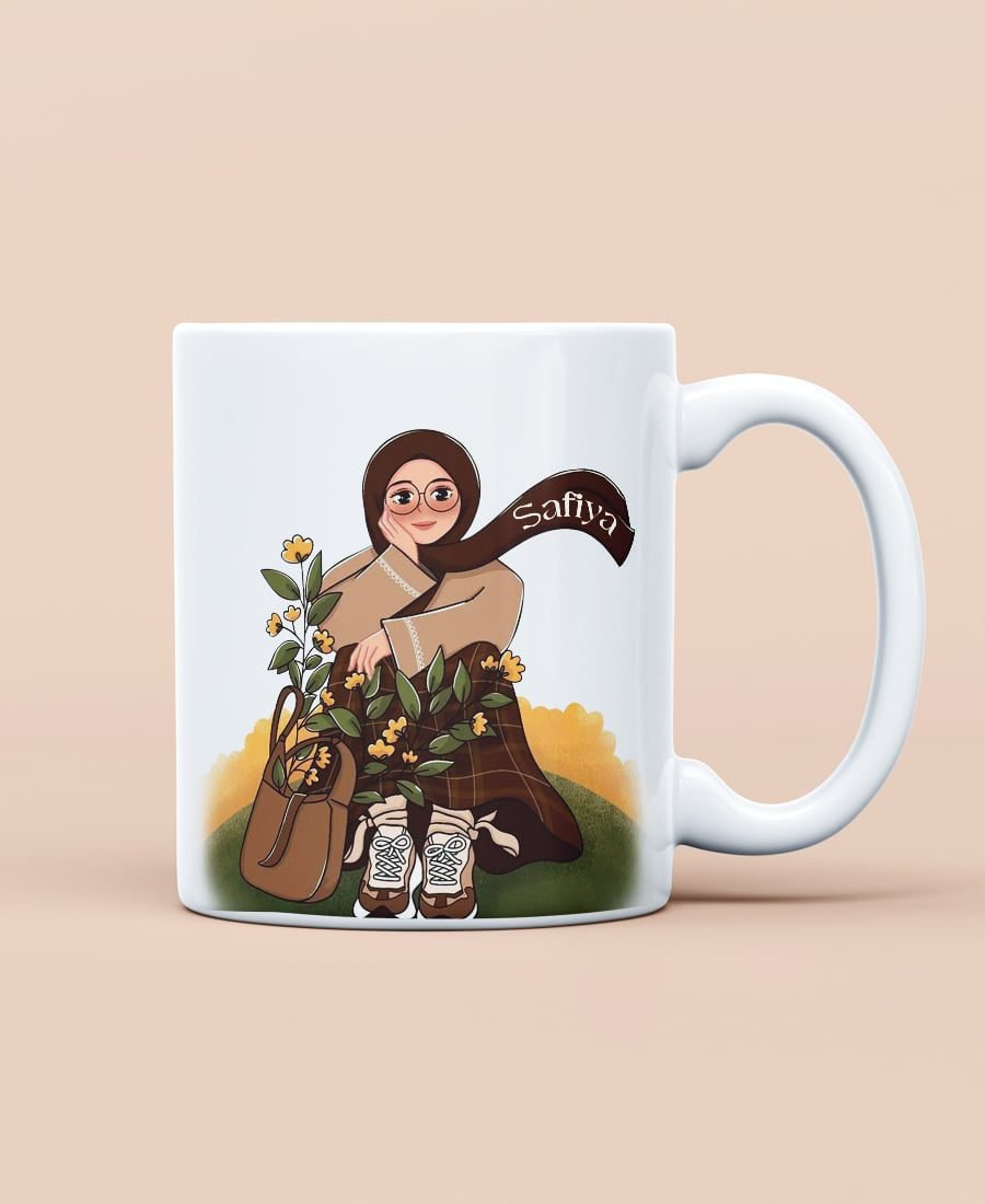 Surrounded by blooming yellow flowers, a Hijabi girl sits peacefully in a lush garden — a scene that speaks of serenity, strength, and femininity. This delicate artwork is printed on a premium white mug and topped with your personalized English name, making it a heartfelt keepsake or gift.