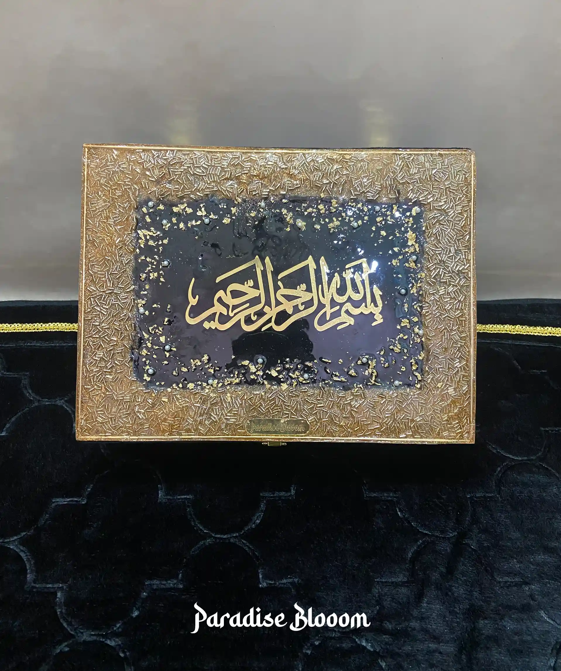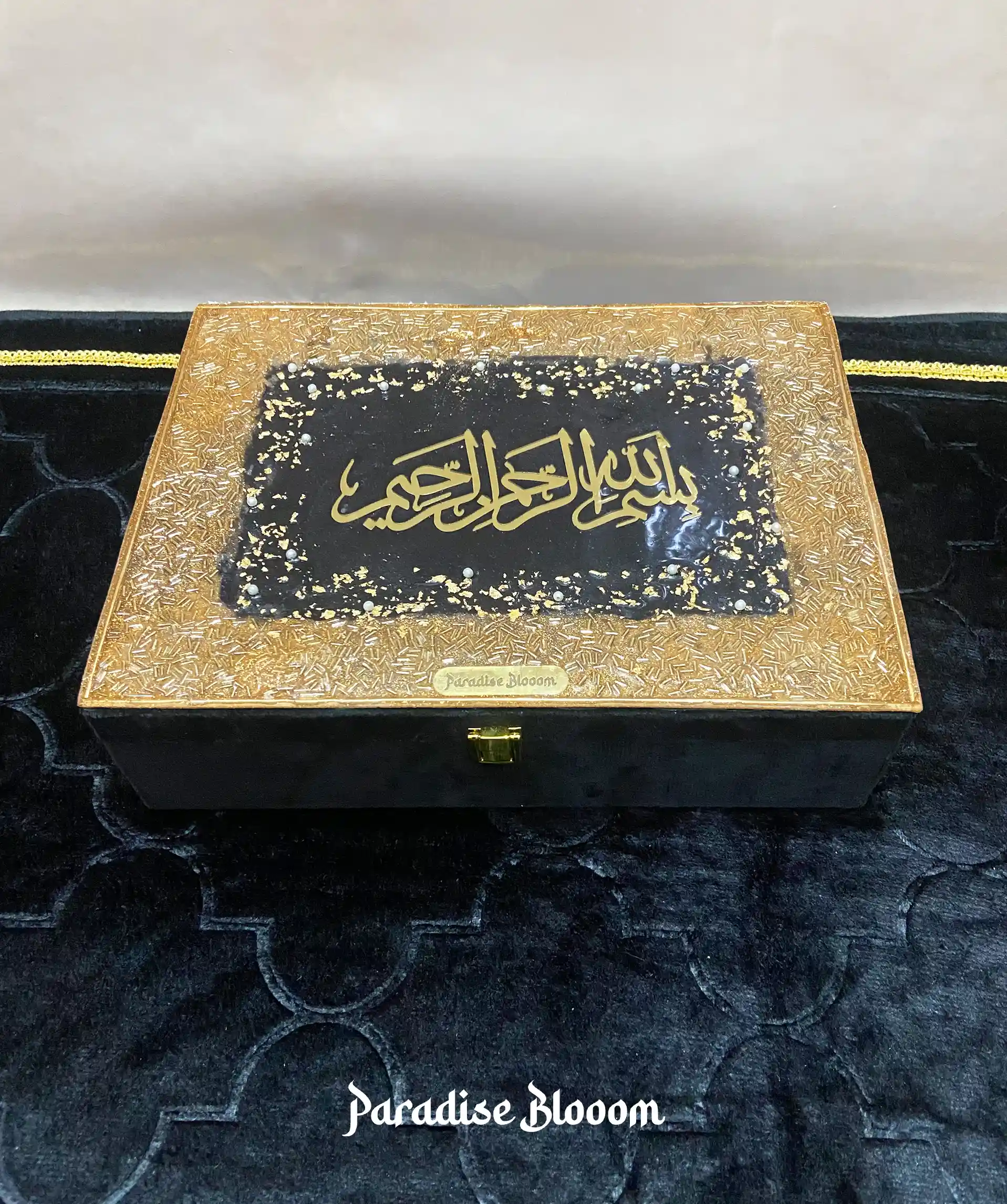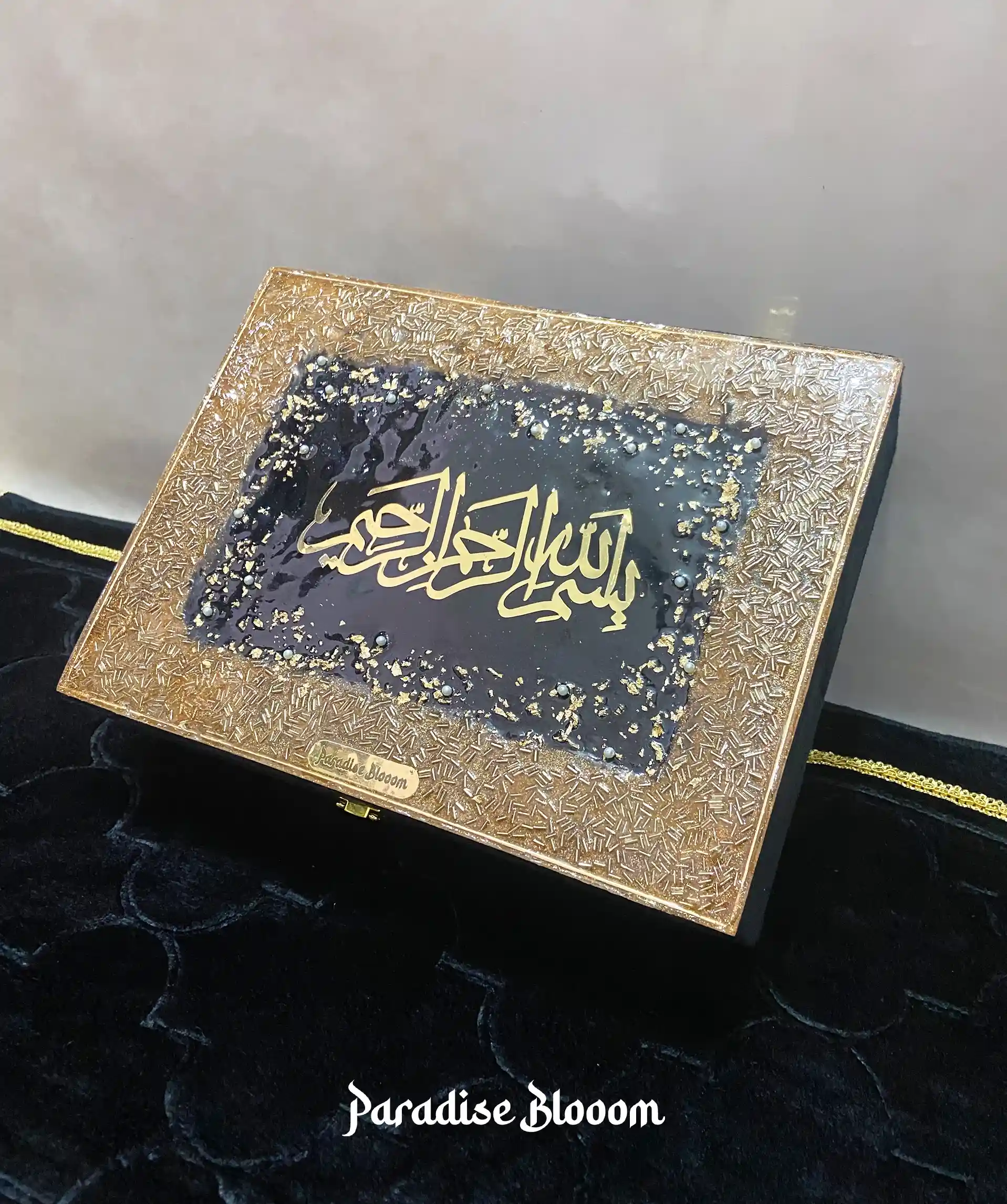 This Premium Designer Quran Box is thoughtfully handcrafted to hold your sacred items with deep care and meaning. Wrapped in rich, soft-touch fabric and crowned with a striking resin Bismillah artwork, it’s more than just a box — it’s a personal sanctuary of devotion.