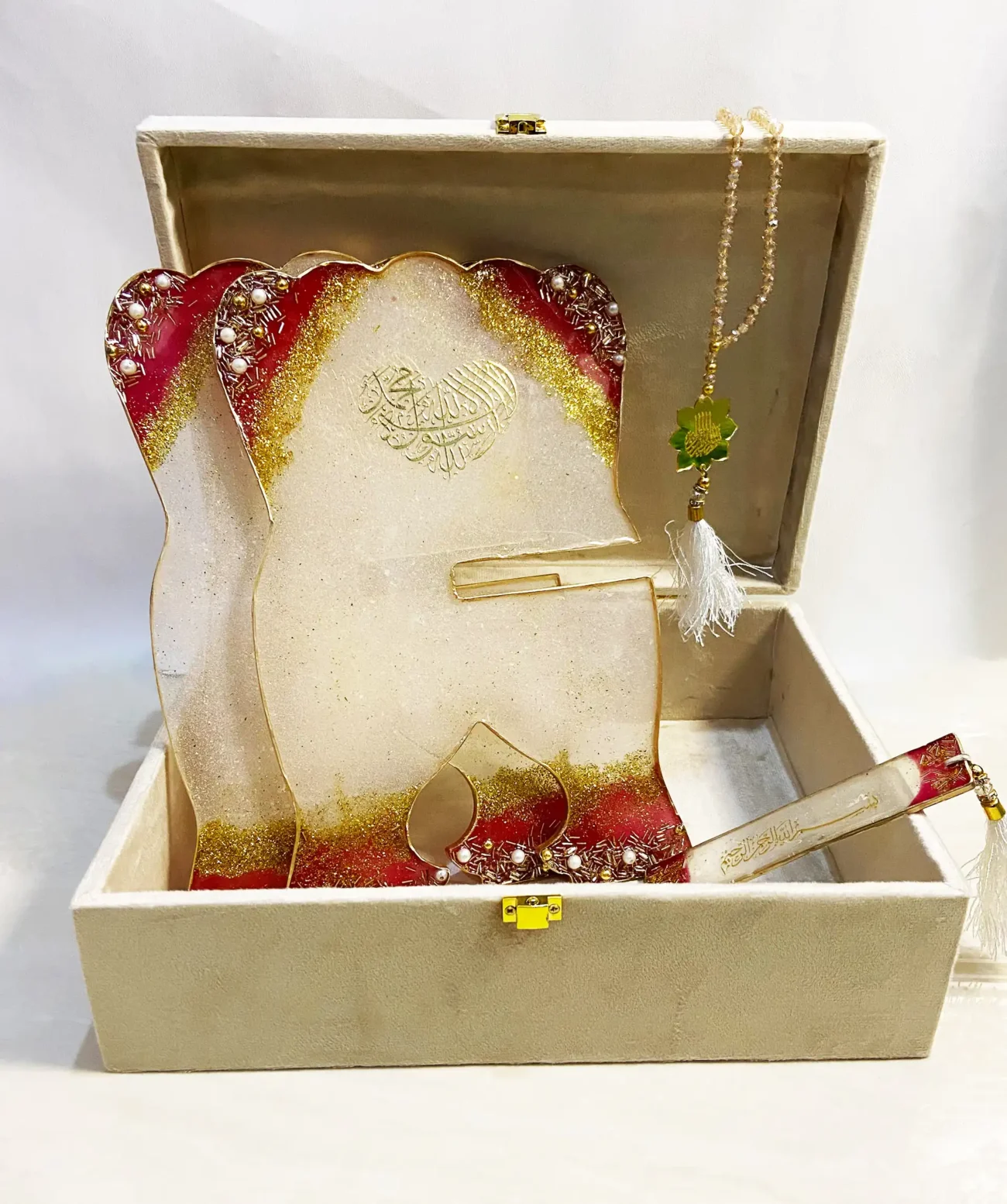 Introducing our Premium Ibadat Box Set – a luxurious spiritual hamper curated with love and intention. Thoughtfully handcrafted, this set features a Designer Quran Box adorned with resin Bismillah artwork, offering a beautiful way to preserve your most cherished items of worship.