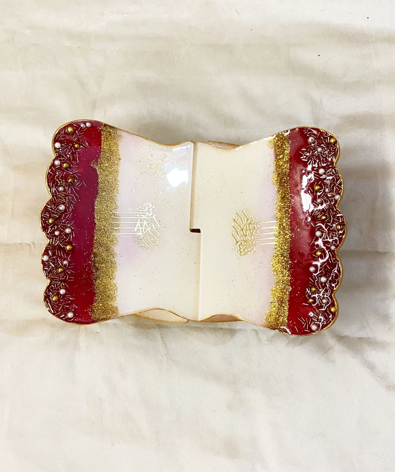 Each Rehal is lovingly poured and crafted by hand, using high-quality, durable resin — ensuring clarity, strength, and a stunning glass-like finish. Delicate accents like gold flakes, floral elements, or butterflies are added within the layers, making every piece unique and deeply meaningful.