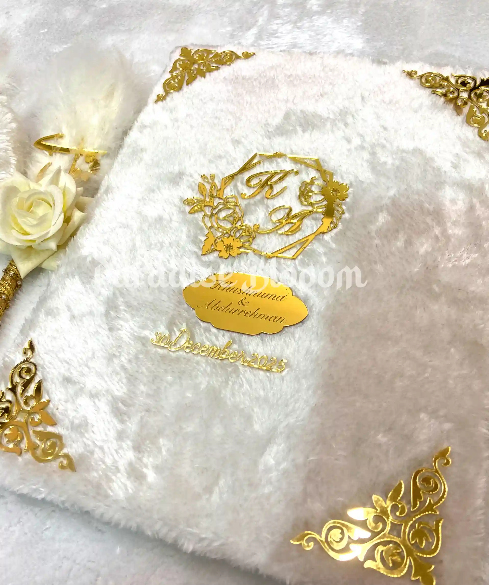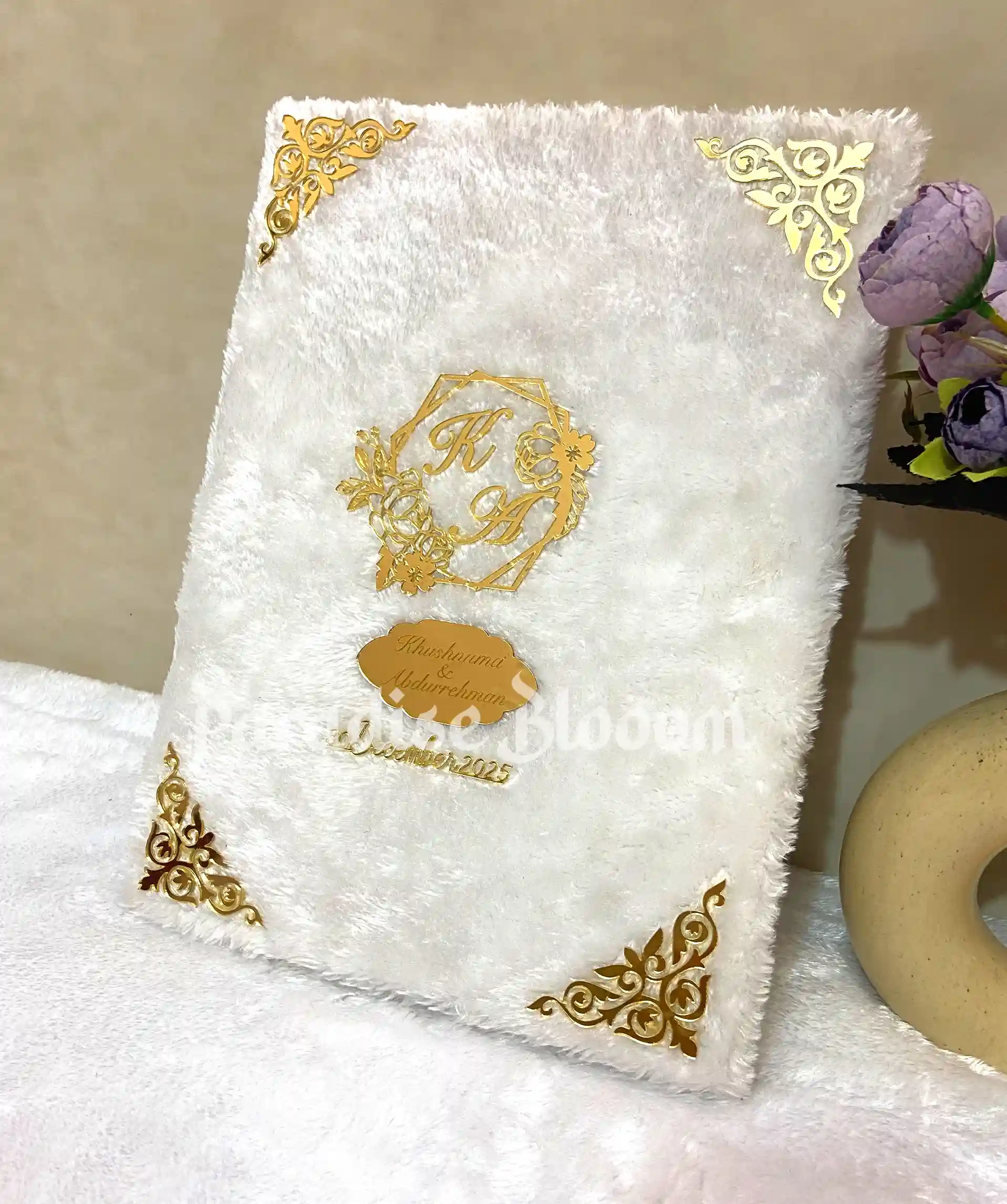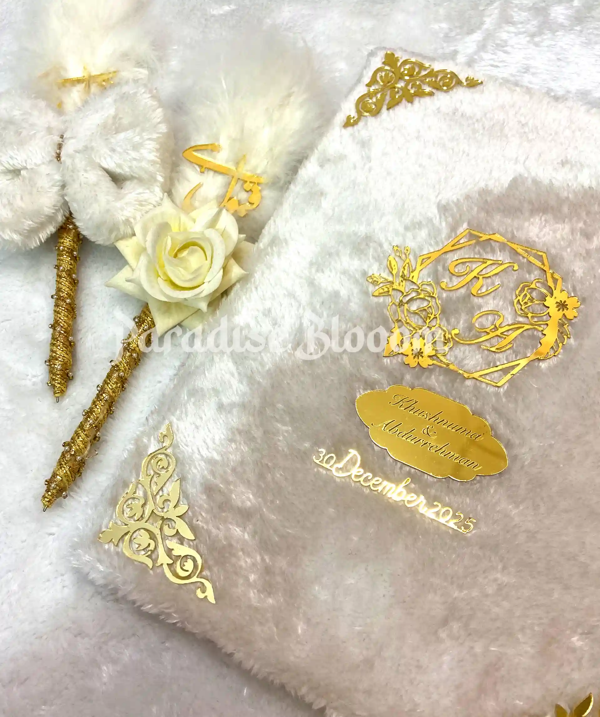 Wrapped in rich, premium velvet, the cover exudes softness and sophistication, while the intricate design details add an elegant charm that reflects the sacredness of the occasion. The highlight — your personalized names delicately placed on the cover — makes this booklet a one-of-a-kind treasure, made just for you.