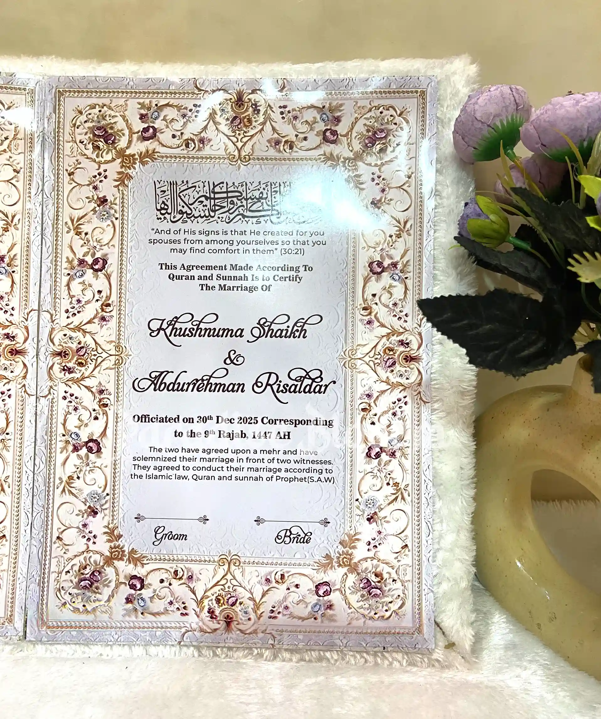 Whether you’re preserving your Nikah ceremony, gifting it to a loved one, or placing it in your memory box, this booklet is more than a document — it’s a symbol of love, commitment, and dua.